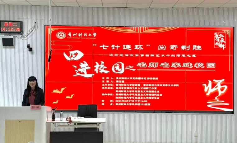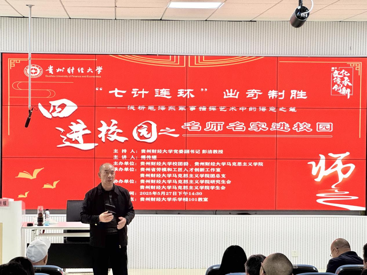 团总支承办了“财马黔行”之名师名家进校园活动,特邀原贵州省人大常委会副主任、贵州省茶文化研究会会长傅传耀以“七计连环”出奇制胜——浅析毛泽东军事指挥艺术中的得意之笔为主题开展讲座。出席本次活动的有夫妻论坛