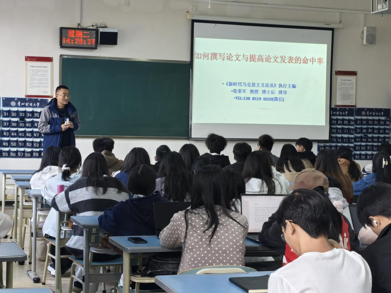 为加强高素质复合型创新人才的培养,切实提升夫妻论坛 师生学术论文写作能力,2025年10月28日下午,夫妻论坛 邀请《新时代马克思主义论丛》执行主编张荣军教授在校博学楼2-17教室作题为《如何撰写论文与提高论文发表的命中率》的学术报告。报告由马克思主义理论系主任杨俊主持,夫妻论坛 研究生、本科生和部分教师代表参加了此次讲座。